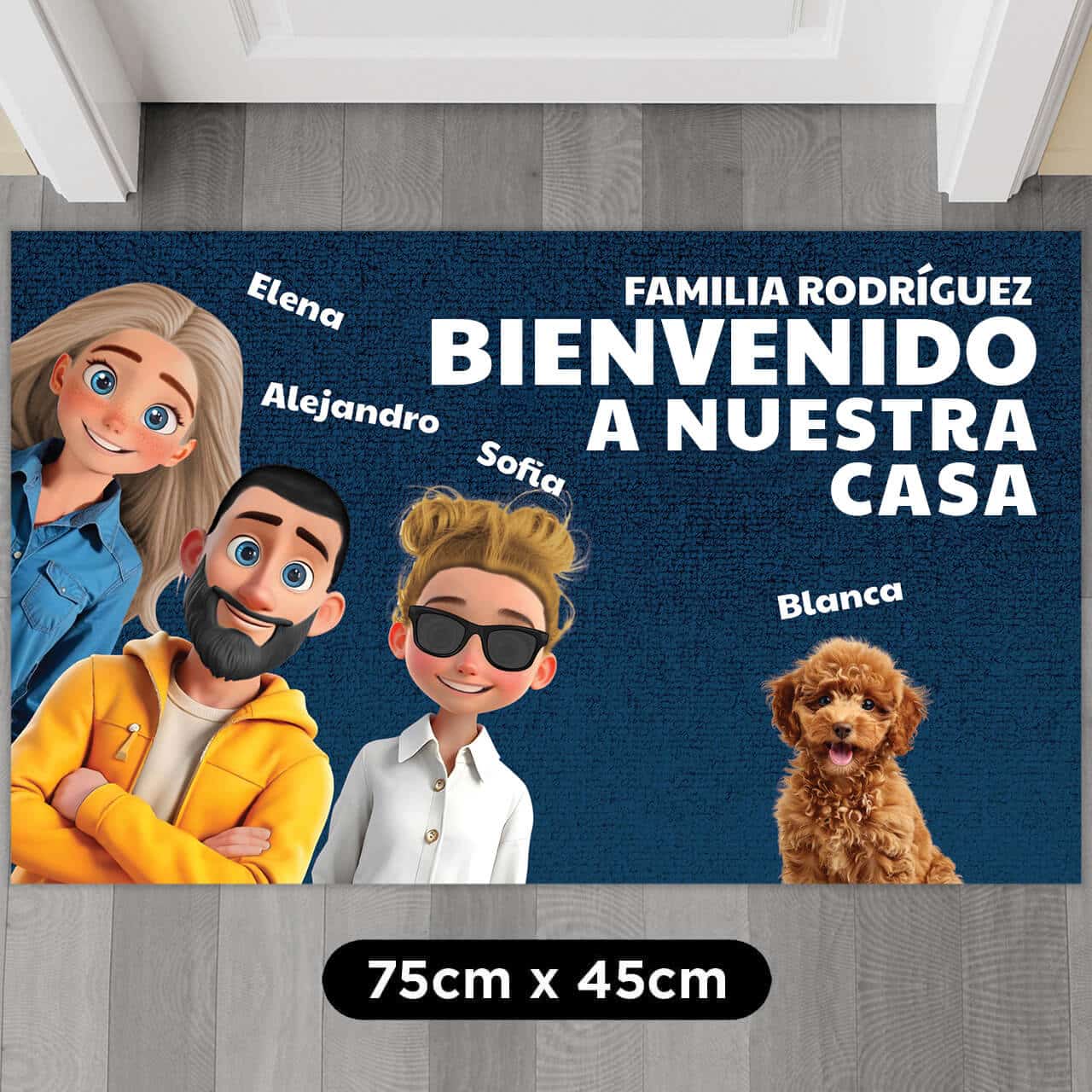 Da la bienvenida a casa con un felpudo familiar personalizado con adorables imágenes prediseñadas al estilo de dibujos animados de tu familia, mascotas e incluso tu apellido. Elige entre 3 frases conmovedoras y varios colores de fondo para crear un felpudo tan único como tu familia.
